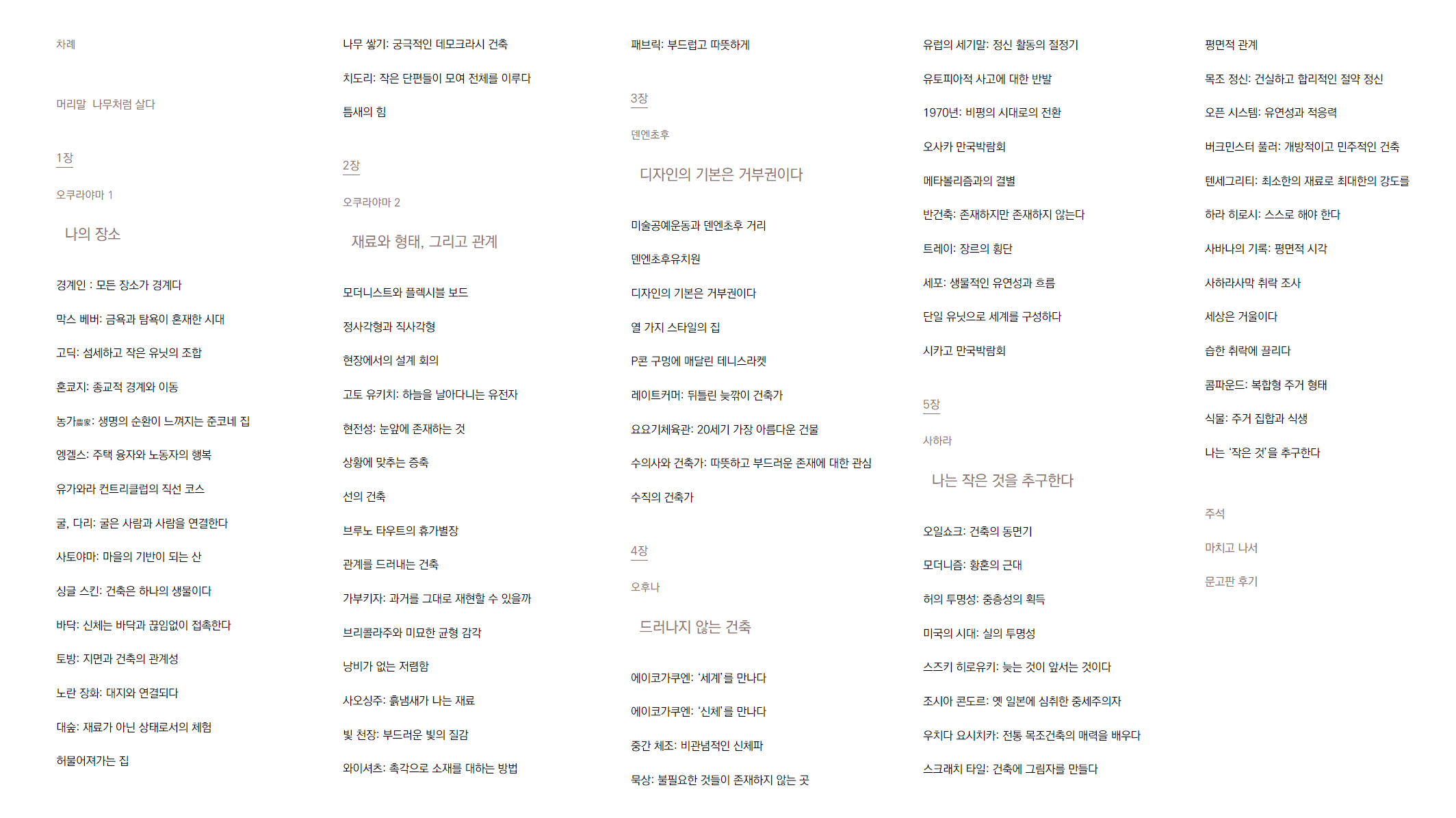 인상깊었던 부분은 건축대가들의 어렸을적 사상적, 종교적 몰입이, 그들의 건축 사상의 근간을 이루고 있다는 이야기이다. 생각해보면 어렸을 적 나 또한 종교적으로 몰입했던 시기가 있었고 그 기점이 지금의 건축적 생각의 토대 정도로는 작용했다는 것이다. 그 내용은 저번에 게시한 ‘2017년처럼 살기‘ 라는 글에 나타나있고, 이 책과 연결되어 이야기가 연결되는 것이 몹시 흥미로운 부분이 아닐 수 없었다.