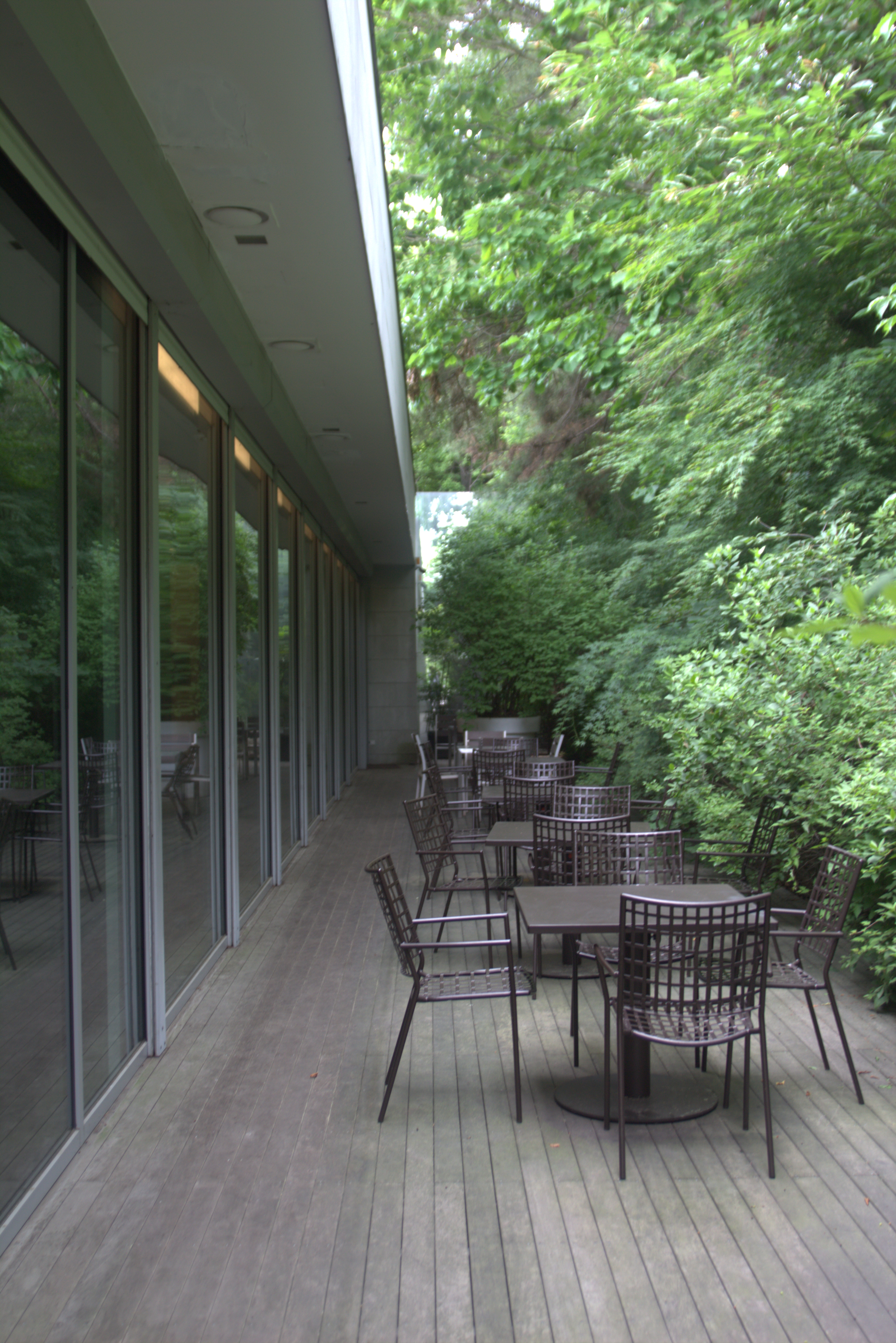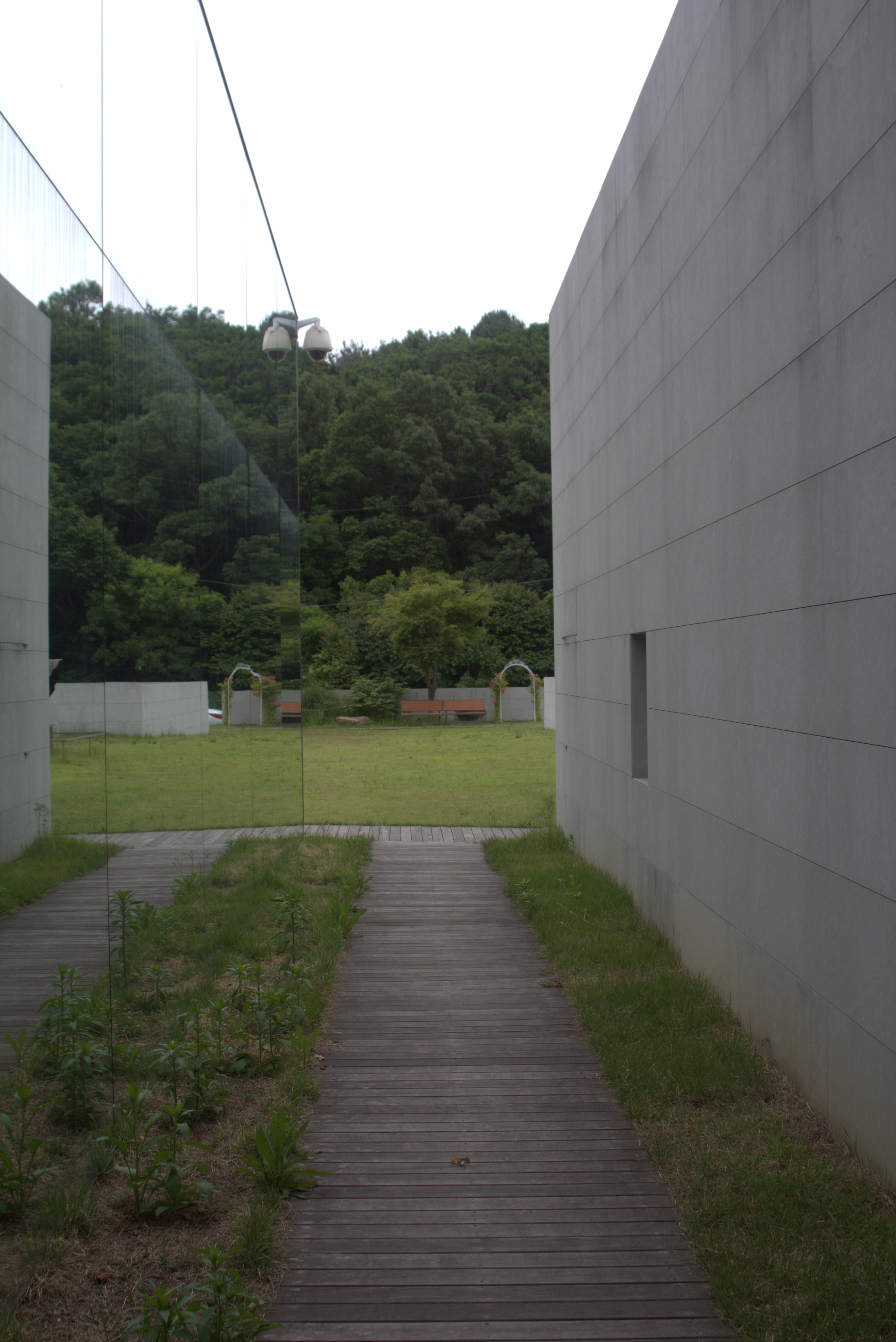 카페에서 다양한 길로 이어져 있다. 테라스를 통해 나와 길을 쭉 따라가면 오른쪽 사진처럼 석재와 은경으로 마감된 건물을 볼 수 있다. 은경을 이용하여 자연을 반사시켜 자연과 건축물을 한 번에 보여주도록 의도한 것 같았다. 아니면 건축물에 자연을 담은 것인가? 다양한 해석이 있을 것 같다. 오른쪽 사진의 길을 따라가면 앞에서 소개한 입구의 오른쪽 편에 있던 정원으로 연결된다.