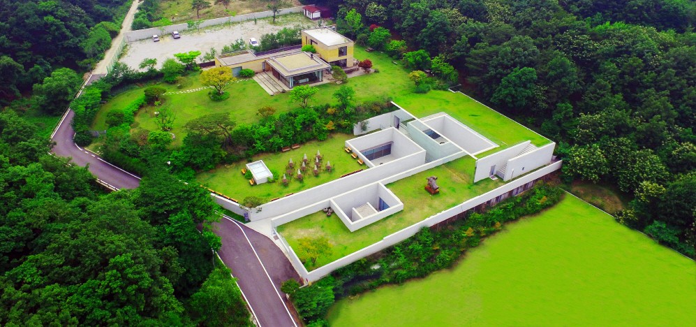 사진을 보면 집 한 채와 해든 뮤지움이 보인다. 위쪽에 위치한 집은 해든 뮤지움의 관장인 박춘순 광장의 개인 공간인 트리플하우스이다. 박춘순 관장이 2007년 배대용 건축가에게 의뢰하여 트리플 하우스를 마련한 것이 인연이 되어 해든 뮤지움이 조성된 것이다. 해든뮤지움이 땅속으로 들어간 것은 자연 속의 갤러리를 떠올리며 풍경을 해치지 않도록 하기 위해서라고 한다. 위 사진을 다시 보면 트리플하우스와 해든뮤지움이 데칼코마니처럼 대칭을 이룬 것을 볼 수 있을 것이다. 이는 트리플 하우스가 '양', 해든뮤지움이 '음'이 되는 형태로 미술관은 땅 속에 숨어서 트리플 하우스의 시선을 보존하도록 의도한 것이라고 한다.