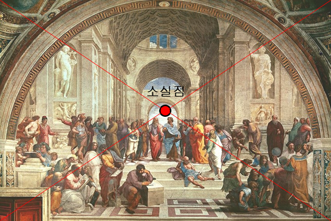 ![]() 라파엘로 - 아테네 학당 원근법을 바탕으로 소실점을 설정하여 수학적으로 재구성된 그림. |
