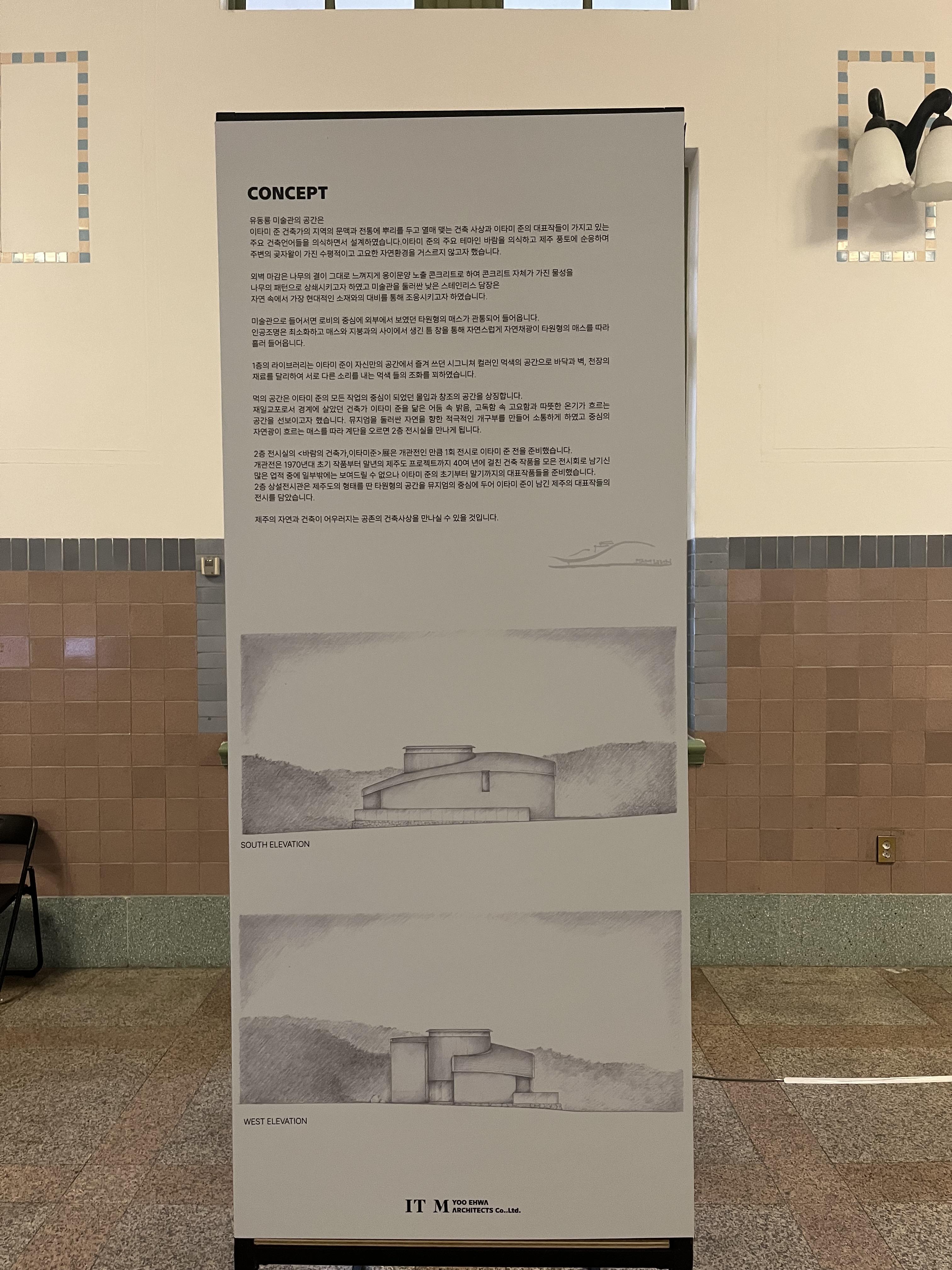 '유동룡미술관의 공간은 이타미준 건축가의 지역의 문맥과 전통에 뿌리를 두고 열매 맺는 건축사상과 이타미준의 대표작들이 가지고 있는 주요 건축언어들을 의식하면서 설계하였습니다. 이타미준의 주요 테마인 바람을 의식하고 제주의 풍토에 순응하며 주변의 곶자왈이 가진 수평적이고 고요한 자연환경을 거스르지 않고자 했습니다.'
